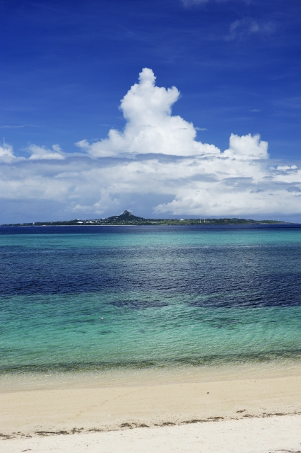 ↑ 備瀬の浜から「伊江島」を見渡すことができます