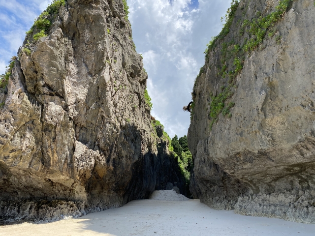 - 細い崖に囲まれた道を進むと、目の前は美しい空と海。