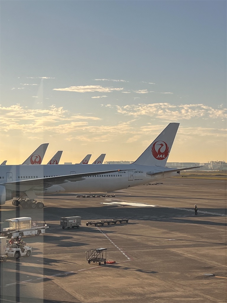 飛行機はJALの朝便です!